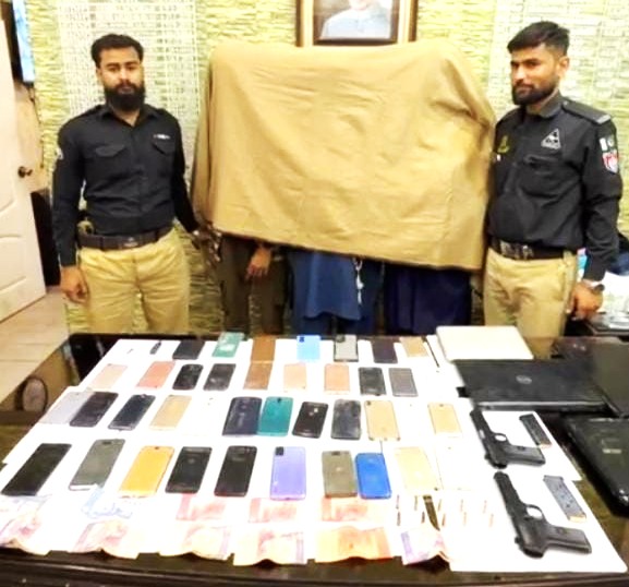 A large cache of stolen items was recovered from their possession, including mobile phones of various brands such as iPhone and Samsung. Police said they seized more than 40 mobile phones, two pistols with ammunition, four laptops and looted cash.