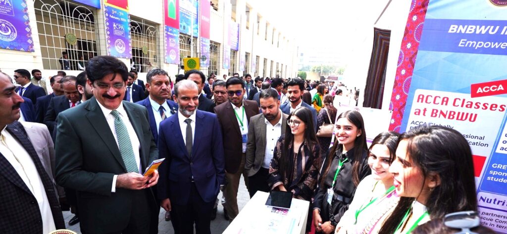 The stall was visited by Sindh Chief Minister Syed Murad Ali Shah, Speaker Syed Awais Qadir Shah, Provincial Home Minister Zia ul Hassan Lanjar, and delegations from the National, Punjab, and Balochistan Assemblies. Chief Minister Murad Ali Shah commended the visionary leadership of Prof. Dr. Tehmina Nangraj and BNBWU’s contributions to research, innovation, and women’s empowerment, while Speaker Awais Qadir Shah praised the University’s academic progress and the efforts of faculty and students.