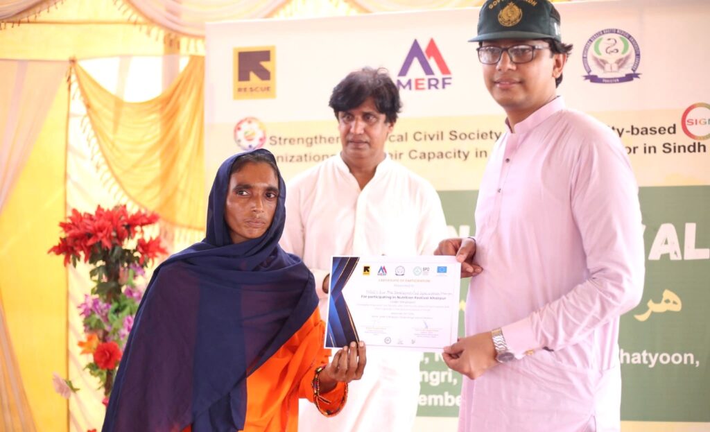 The event took place in Kachi Abadi near BHU Sadar ji Bhatyoon, Taluka Kingri, District Khairpur, under the “Strengthening Local Civil Society and Community-Based Organizations and their Capacity in the Nutrition Sector in Sindh” project, in collaboration with the European Union, International Rescue Committee (IRC), Strengthening Participatory Organization (SPO) and Medical Emergency Resilience Foundation (MERF).