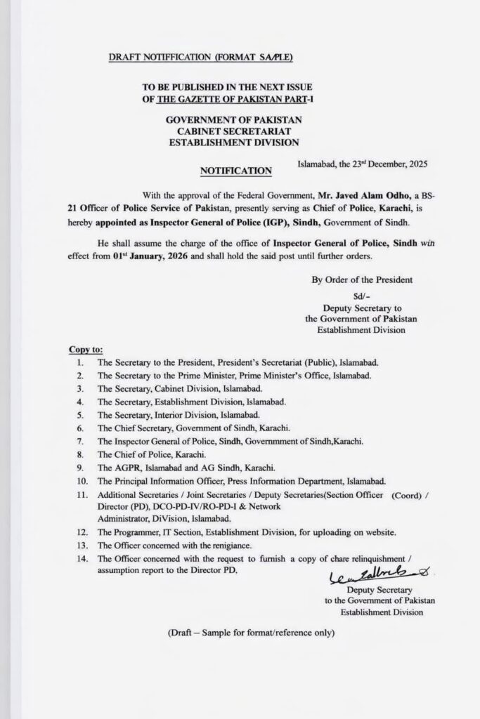 ISLAMABAD/KARACHI: The federal government appointed Javed Alam Odho as the new Inspector General of Sindh Police, following the impending retirement of the current IG, Ghulam Nabi Memon, who is set to leave office on 31 December. A formal notification confirmed that Odho would officially assume charge of the provincial police force from 1 January 2026.