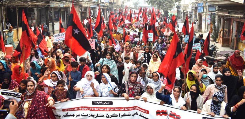 LARKANA: Thousands of people, including a large number of women and children, participated in the “Save Sindh’s Existence and Resources” march organized by Awami Tehreek and Sindhyani Tehreek in Larkana. The protesters demonstrated against the 27th Constitutional Amendment, corporate farming projects, new dams and canals on the Indus River, and what organizers described as the rise of “bandit rule.”