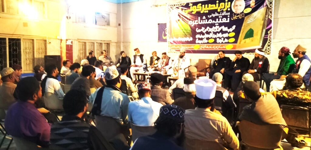Organized by Bazm-e-Naseer Koti, the event took place on other day at the auditorium of the Government Degree College for Boys in North Nazimabad. The mushaira was based on a celebrated line from Naseer Koti’s well-known Na’at, “One who loves the Prophet is united with the Prophet,” which served as the thematic refrain for the evening.