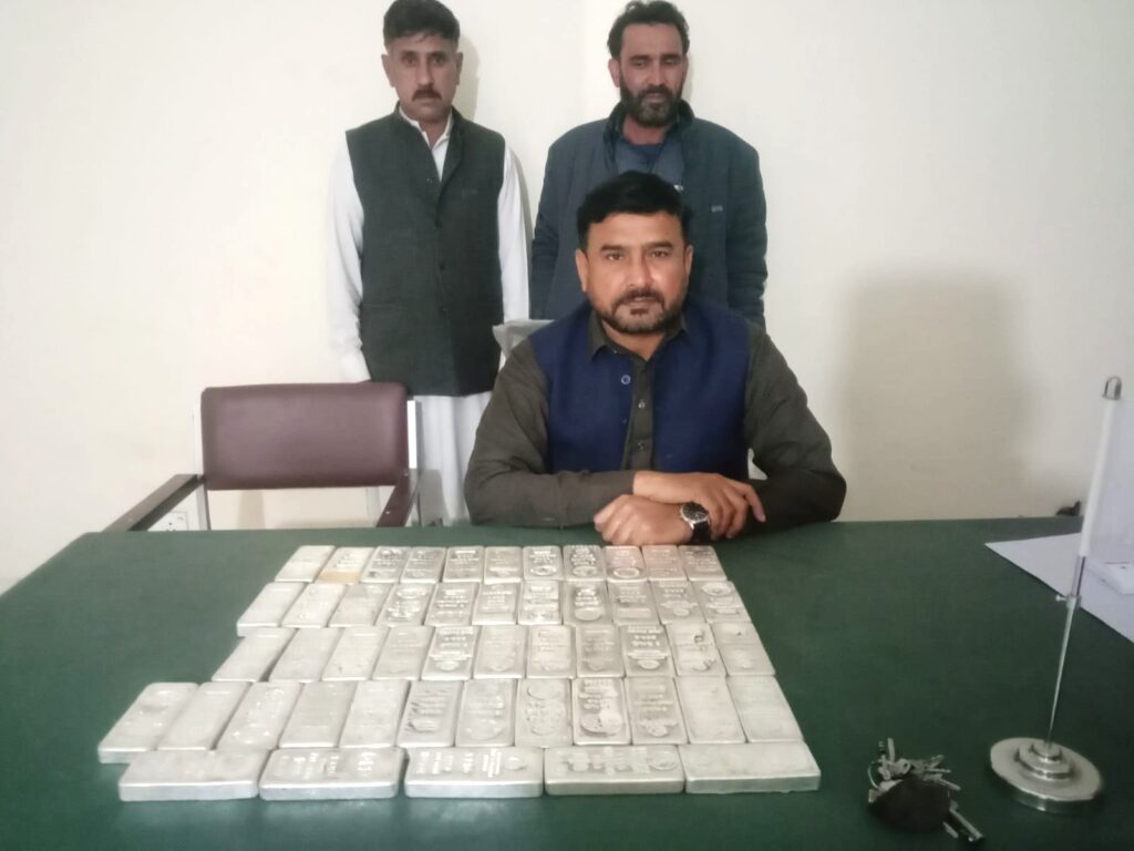 Under the supervision of SDPO Circle Daraban, Inamullah Khan, police conducted a detailed search and recovered 50 silver bars weighing one kilogram each from beneath the rear seat. Each bar bore the “999.9” stamp, indicating high purity.