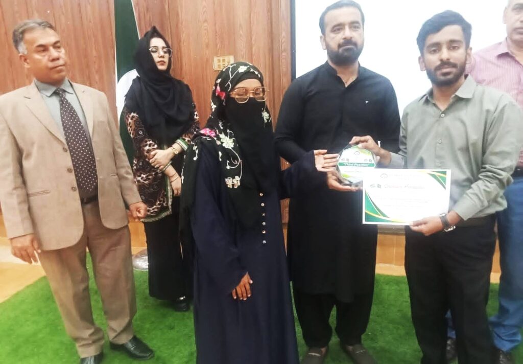 At the conclusion, prizes were awarded to winners. In the declamation contest, Samreen Mahar (BS Part III, English Language and Literature) won first place, with Jannat (BS Part III, English) in second. The third position was shared by Misbah Dahar (BS Part I, Teacher Education) and Usama Soomro (BD Part II, Teacher Education).