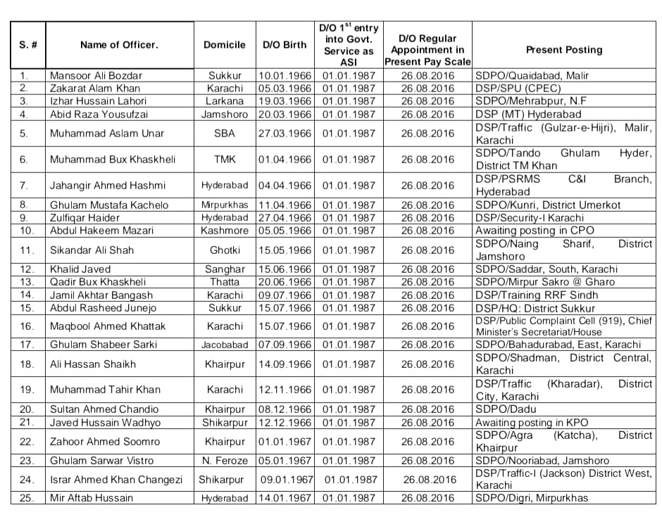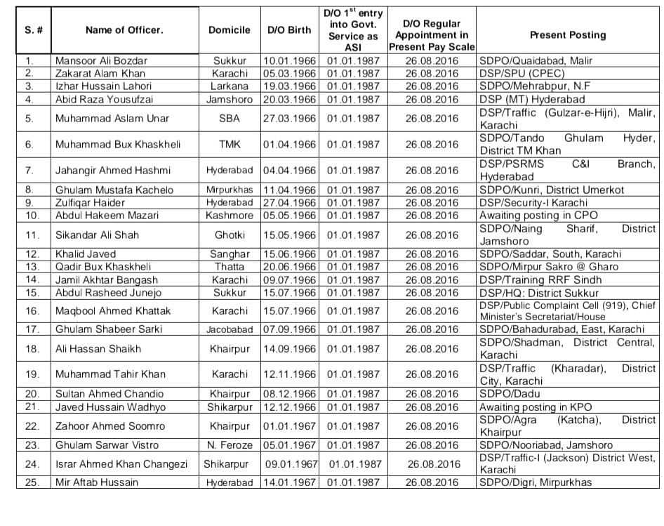 The list of promoted officers further includes Jahangir Ahmed Hashmi, Ghulam Mustafa Kachlo and Zulfiqar Haider, who have been appointed as superintendents of police. Abdul Qayyum Mazari, Sikandar Ali Shah and Khalid Javed are also among those promoted.