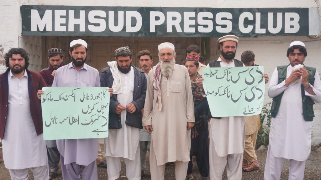 Demonstrators gathered outside the Mehsud Press Club, chanting slogans against the deputy commissioner and the executive engineer of public health. They called for immediate action to end years of official inaction.