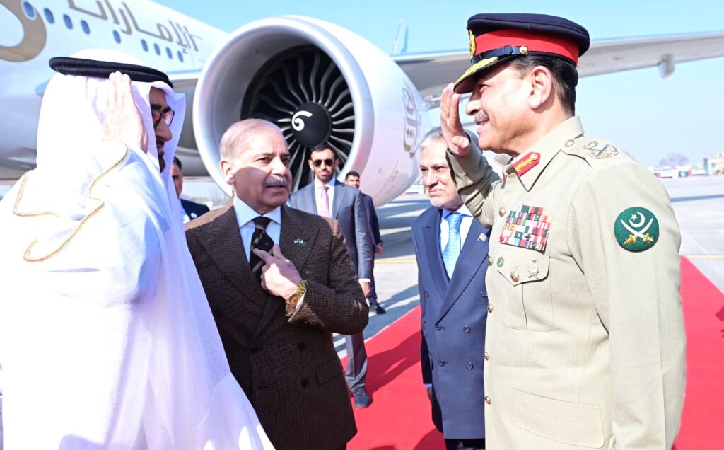 NUR KHAN: A rare and symbolic moment took place at Nur Khan Airbase on Monday as the President of the United Arab Emirates, Sheikh Mohammed bin Zayed Al Nahyan, returned a salute from Pakistan’s army chief, Field Marshal Asim Munir, during the start of his first official visit to Islamabad.