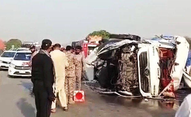 KARACHI: At least 13 people were killed and several others injured in a devastating collision on the M9 Motorway near Kathore on Friday, authorities said. The accident involved an oil tanker, a passenger bus, and multiple other vehicles, and according to officials, the coach was travelling on the wrong side of the road at the time of the crash.