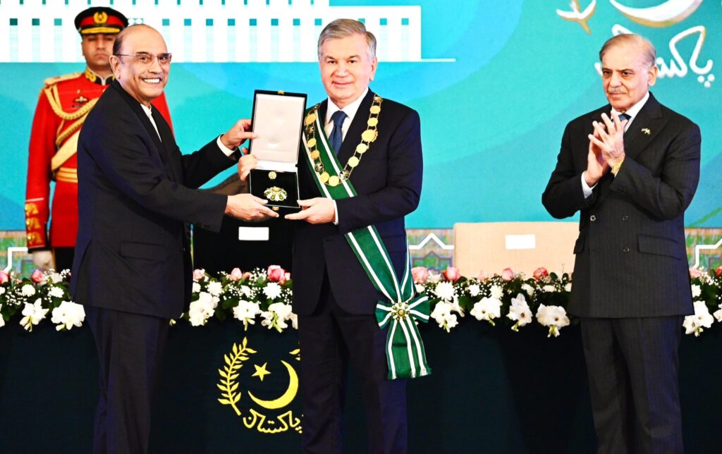 Later, during a Special Investiture Ceremony, President Zardari conferred the Nishan-e-Pakistan on President Mirziyoyev in recognition of his role in strengthening Pakistan-Uzbekistan relations. The ceremony was attended by PM Shehbaz Sharif, federal cabinet members, Air Chief Marshal Zaheer Ahmed Baber Sidhu, diplomats, and parliamentarians, and was followed by a state banquet in honor of the visiting president.